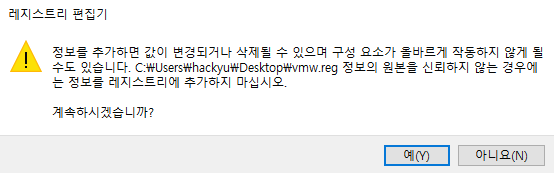 생성된 레지스트리 파일을 실행(더블클릭)해서 레지스트리 추가 과정을 한다.