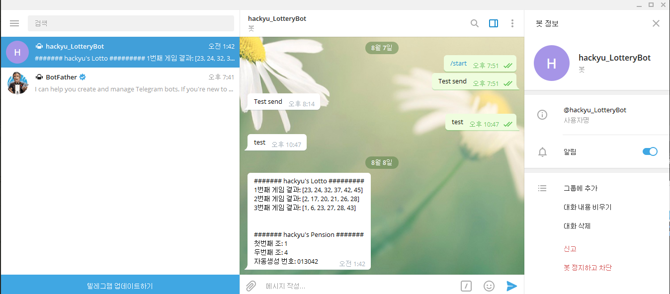 스크립트 실행 결과로 Telegram Bot이 대화창에 복권 추첨번호를 전달하는 것을 확인함.