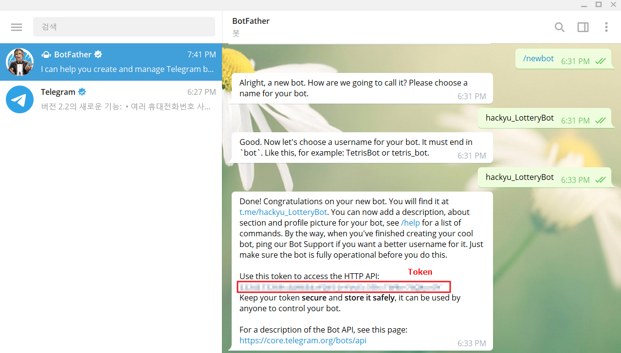 /newbot을 통해 Bot 생성 후 Token 발급받음