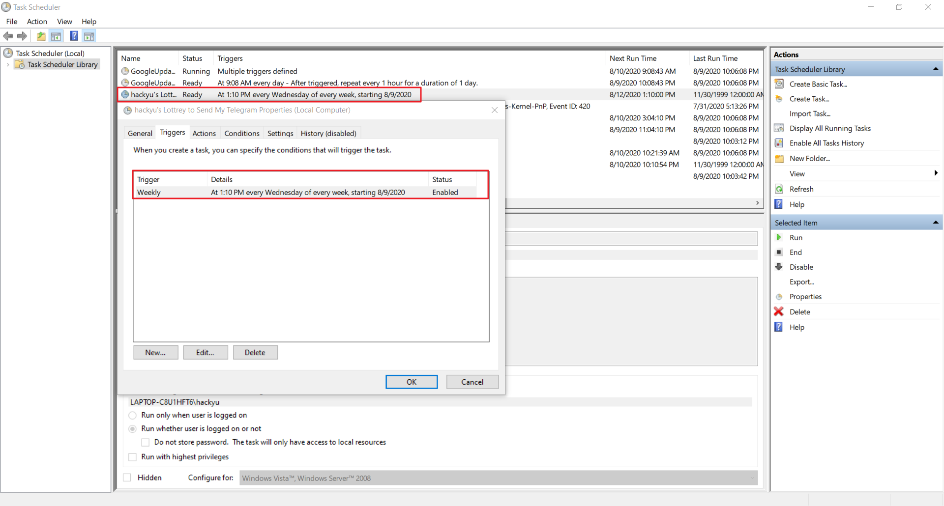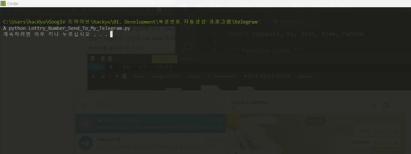 이제 이것을 주기적인 시간에 작업하도록 윈도우 작업 스케줄러 설정을 하면 자동으로 실행하여 복권 추첨번호를 나의 모바일에 있는 Telegram 앱으로 Push하여 알림을 받을 수 있다!!!
